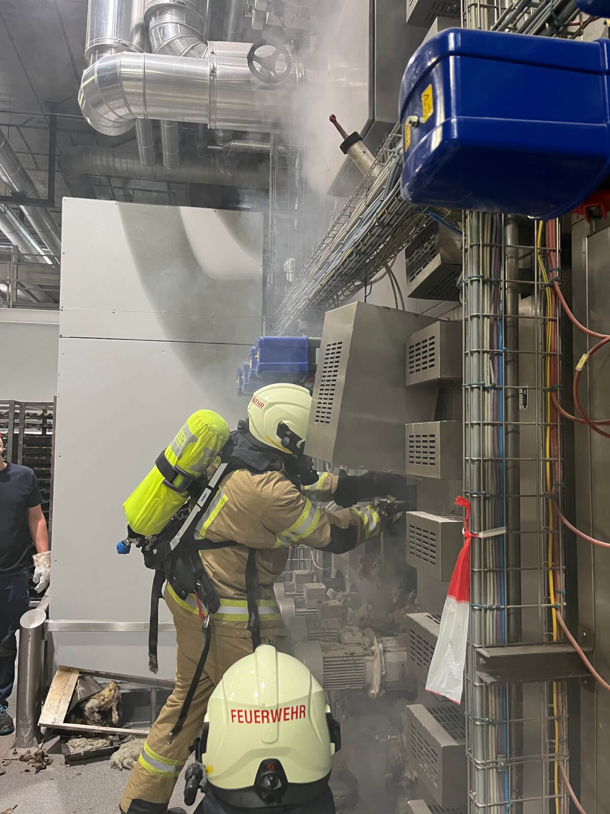 Im Rahmen des Brandmeldealarmes beim Altersheim wurde die Feuerwehr Völs telefonisch verständigt, dass es im Bereich eines Produktionsbetriebes in Völs aufgrund von Schweißarbeiten zu einer Glimmbrandentwicklung gekommen ist. Somit handelte es sich um einen Folgeeinsatz ohne Zusatzalarmierung. Bei Eintreffen des Einsatzleiters konnte nach Erkundung mit den Technikern vor Ort festgestellt werden, dass es bei einem Thermoölofen hinter diversen Verkleidungen zu einer Glimmbrandentwicklung gekommen ist. Die Aufgabe der Feuerwehr bestand darin, in Zusammenarbeit mit den Technikern die Verkleidungen zu demontieren und die glimmende Dämmwolle zu entfernen. Diese Arbeiten wurden von der Feuerwehr Völs mittels schweren Atemschutz unter Anwendung von Schanzwerkzeug und des Speziallöschmittels F500 durchgeführt. Nach Kontrolle mit der Wärmebildkamera und Durchnässung des restlichen Dämmmaterials konnte der Einsatz für die Feuerwehr Völs beendet werden und dem Betreiber unter Anweisung des Erfordernisses einer Brandsicherheitswache und laufenden Kontrolle übergeben werden.