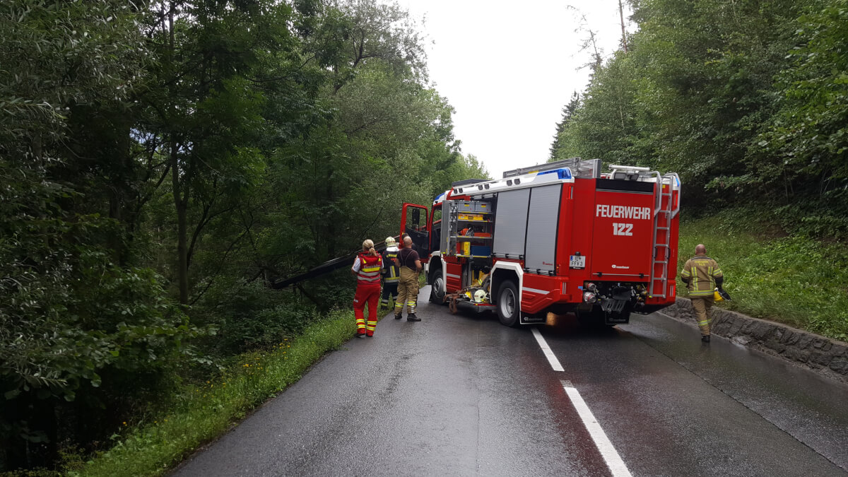 Am Mittwoch wurde die Feuerwehr Völs zu einem schweren Verkehrsunfall auf die Götzner Straße alarmiert. Aus bisher unbekannter Ursache, geriet das Fahrzeug von der Fahrbahn ab und blieb etwa 30m unterhalb der Straße in steilem abschüssigem Gelände liegen. Die beiden verletzen Fahrzeuginsassen konnten sich selbst aus dem total zerstörten Wrack befreien und noch selbstständig die Böschung hinauf klettern. Das Fahrzeug wurde im Anschluss mittels Seilwinde geborgen. Die Landesstraße musste für die Dauer des Einsatzes vollständig gesperrt werden.
