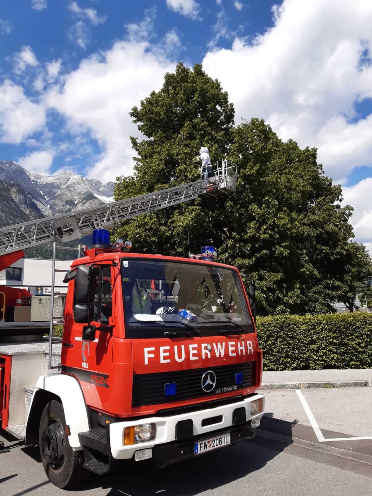 Am Donnerstagnachmittag haben wir einen Imker mit der Drehleiter unterstützt. Ein Bienenschwarm hat sich in der Albertistraße auf einem Baum niedergelassen und musste vom Imker eingefangen werden. Bienen sind sehr wichtige Tiere, daher wurde der Imker von uns unterstützt. Das entfernen von Wespennester wird jedoch von Fachfirmen durchgeführt