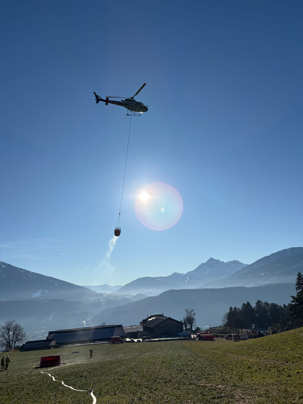 Wir unterstützen vor Ort bereits seit vier Tagen mit unserem TLFA 3000/200 im Pendelverkehr, um die Wasserversorgung für den Einsatz der Hubschrauber sicherzustellen.