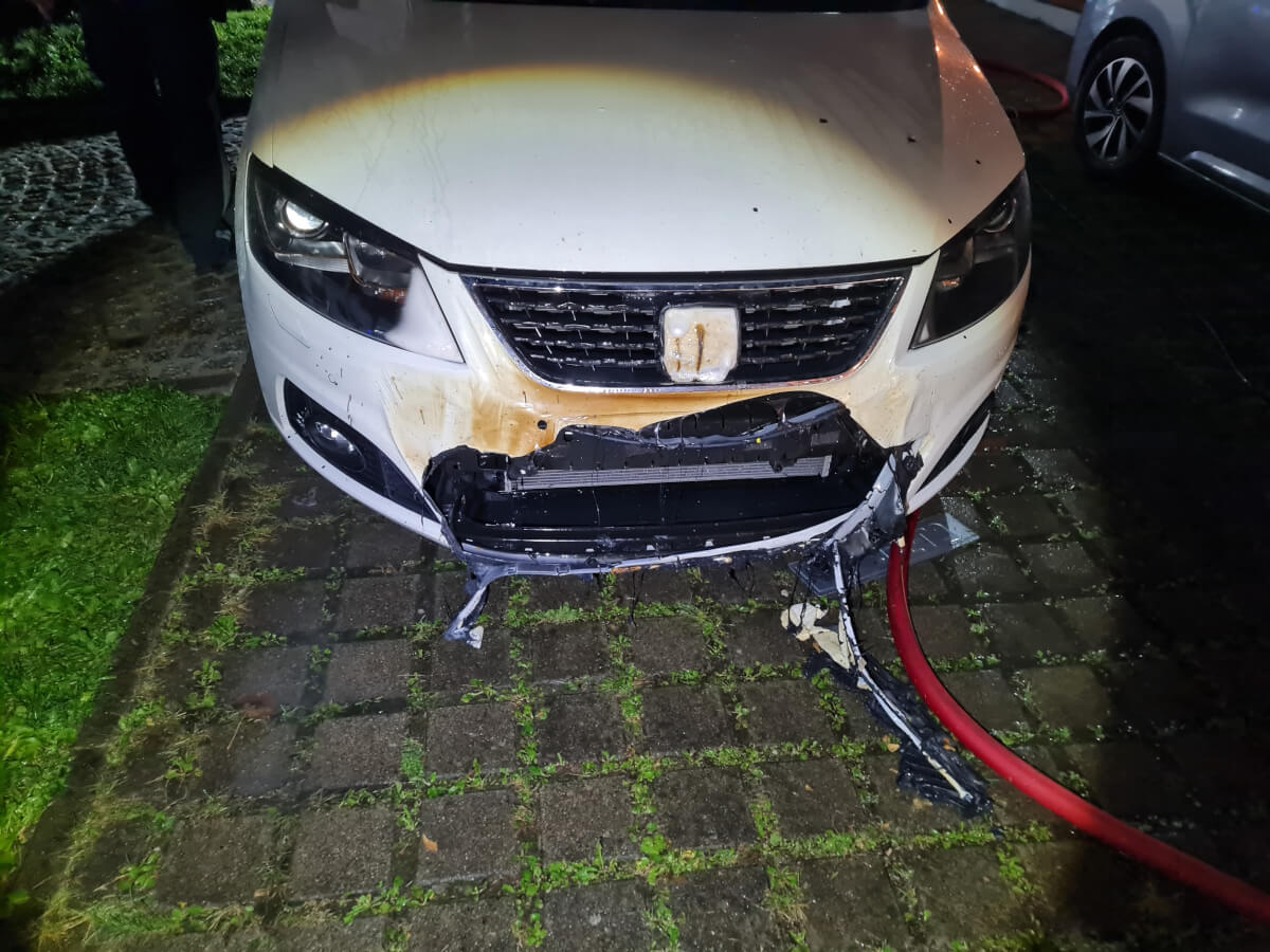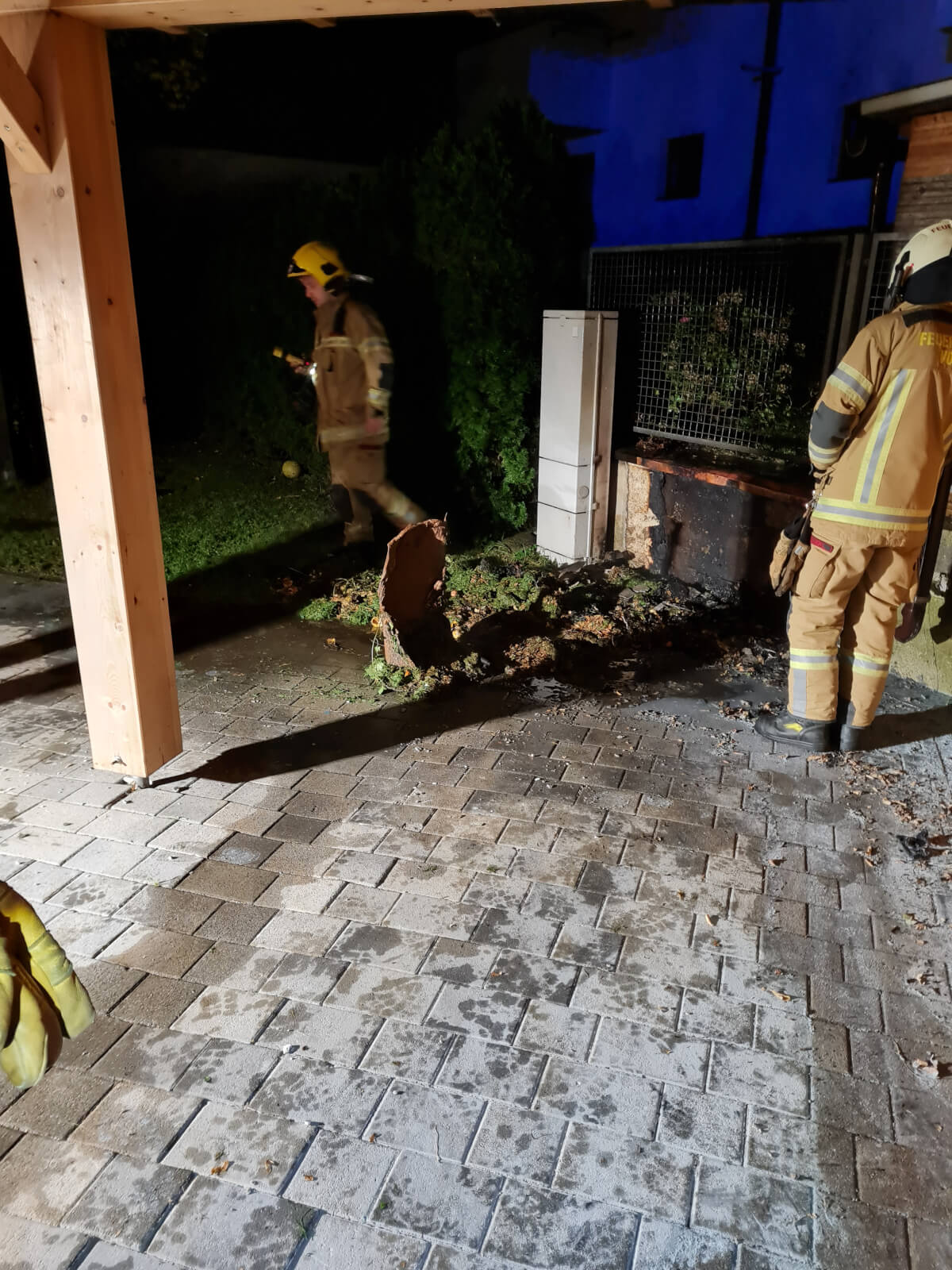 Aus noch unbekannter Ursache hatten mehrere Mülleimer, welche hinter dem Carport standen, Feuer gefangen und hatte bereits auf das Fahrzeug übergegriffen.