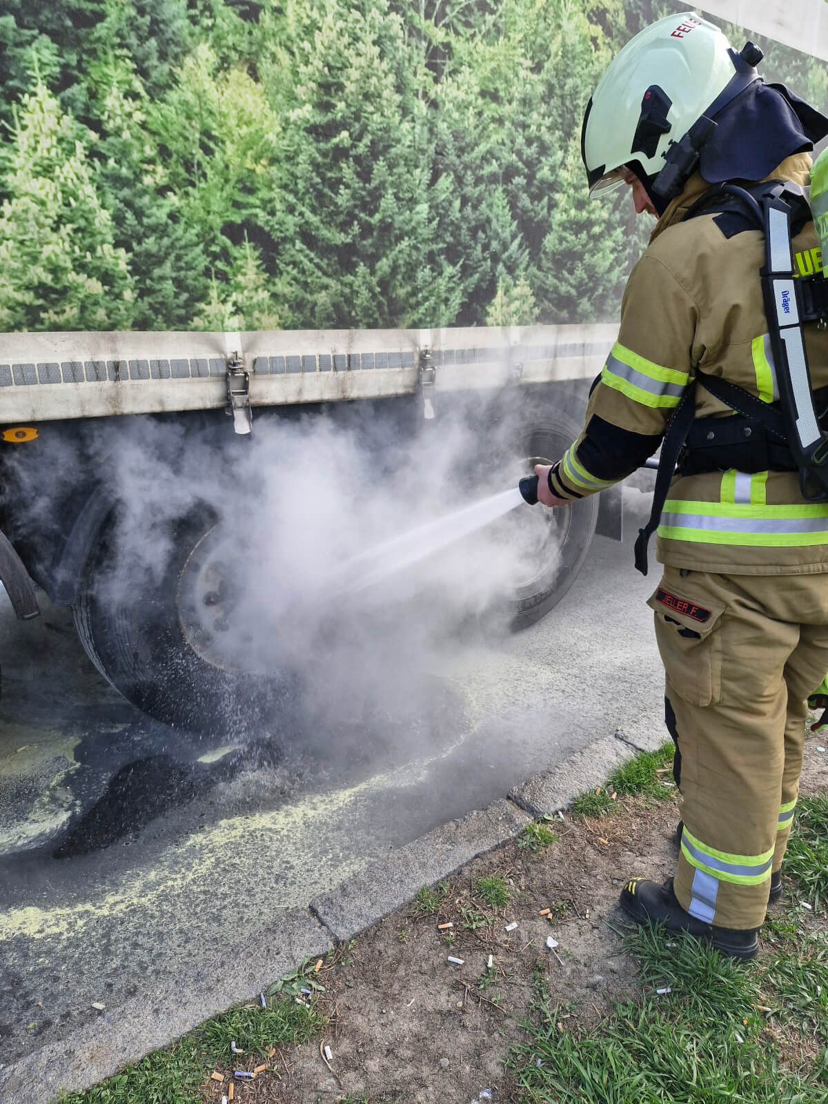 Ein Reifen auf der linken Seite des LKWs war bereits von der vor Ort befindlichen Polizeistreife mit einem Feuerlöscher abgelöscht worden.
