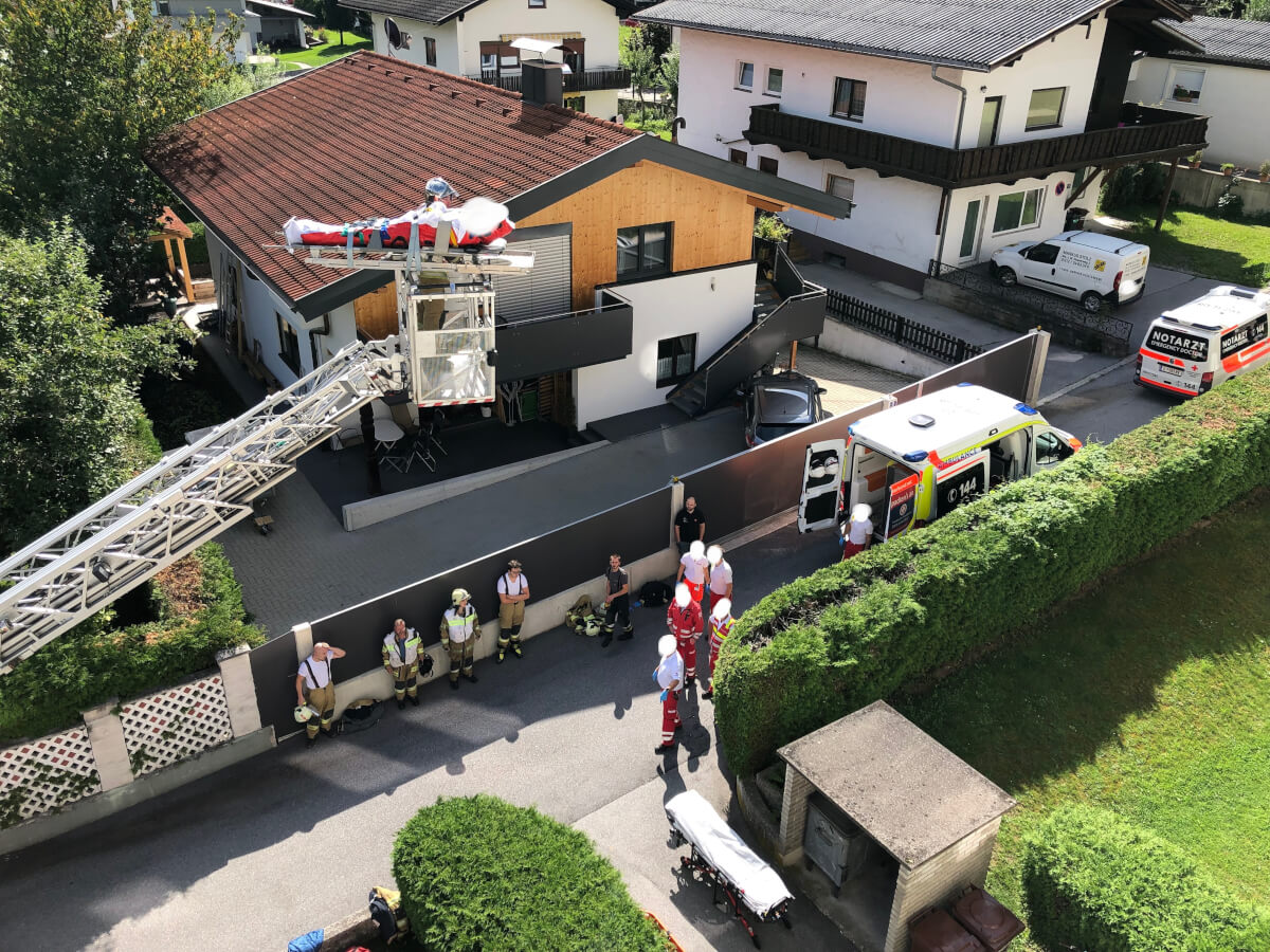 Heute Vormittag wurde die Feuerwehr Völs durch den Rettungsdienst nachalarmiert. Um einen Patienten möglichst schonend aus dem 3. OG zu retten, musste dieser mittels Drehleiter abtransportiert werden.