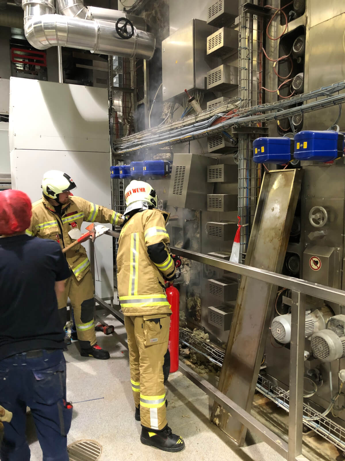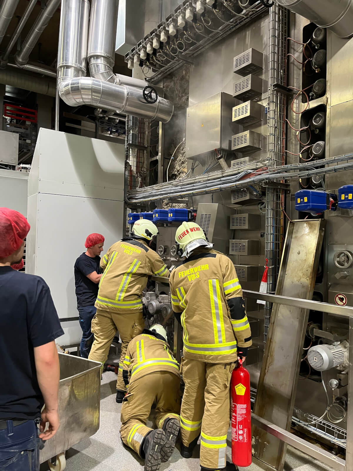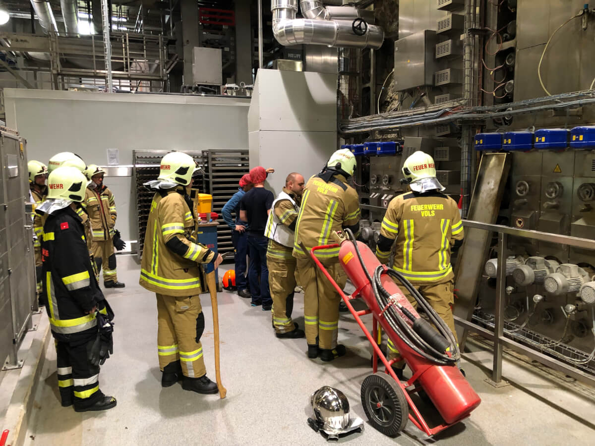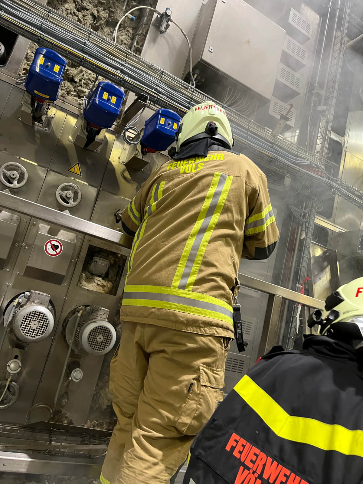 Im Rahmen des Brandmeldealarmes beim Altersheim wurde die Feuerwehr Völs telefonisch verständigt, dass es im Bereich eines Produktionsbetriebes in Völs aufgrund von Schweißarbeiten zu einer Glimmbrandentwicklung gekommen ist. Somit handelte es sich um einen Folgeeinsatz ohne Zusatzalarmierung. Bei Eintreffen des Einsatzleiters konnte nach Erkundung mit den Technikern vor Ort festgestellt werden, dass es bei einem Thermoölofen hinter diversen Verkleidungen zu einer Glimmbrandentwicklung gekommen ist. Die Aufgabe der Feuerwehr bestand darin, in Zusammenarbeit mit den Technikern die Verkleidungen zu demontieren und die glimmende Dämmwolle zu entfernen. Diese Arbeiten wurden von der Feuerwehr Völs mittels schweren Atemschutz unter Anwendung von Schanzwerkzeug und des Speziallöschmittels F500 durchgeführt. Nach Kontrolle mit der Wärmebildkamera und Durchnässung des restlichen Dämmmaterials konnte der Einsatz für die Feuerwehr Völs beendet werden und dem Betreiber unter Anweisung des Erfordernisses einer Brandsicherheitswache und laufenden Kontrolle übergeben werden.