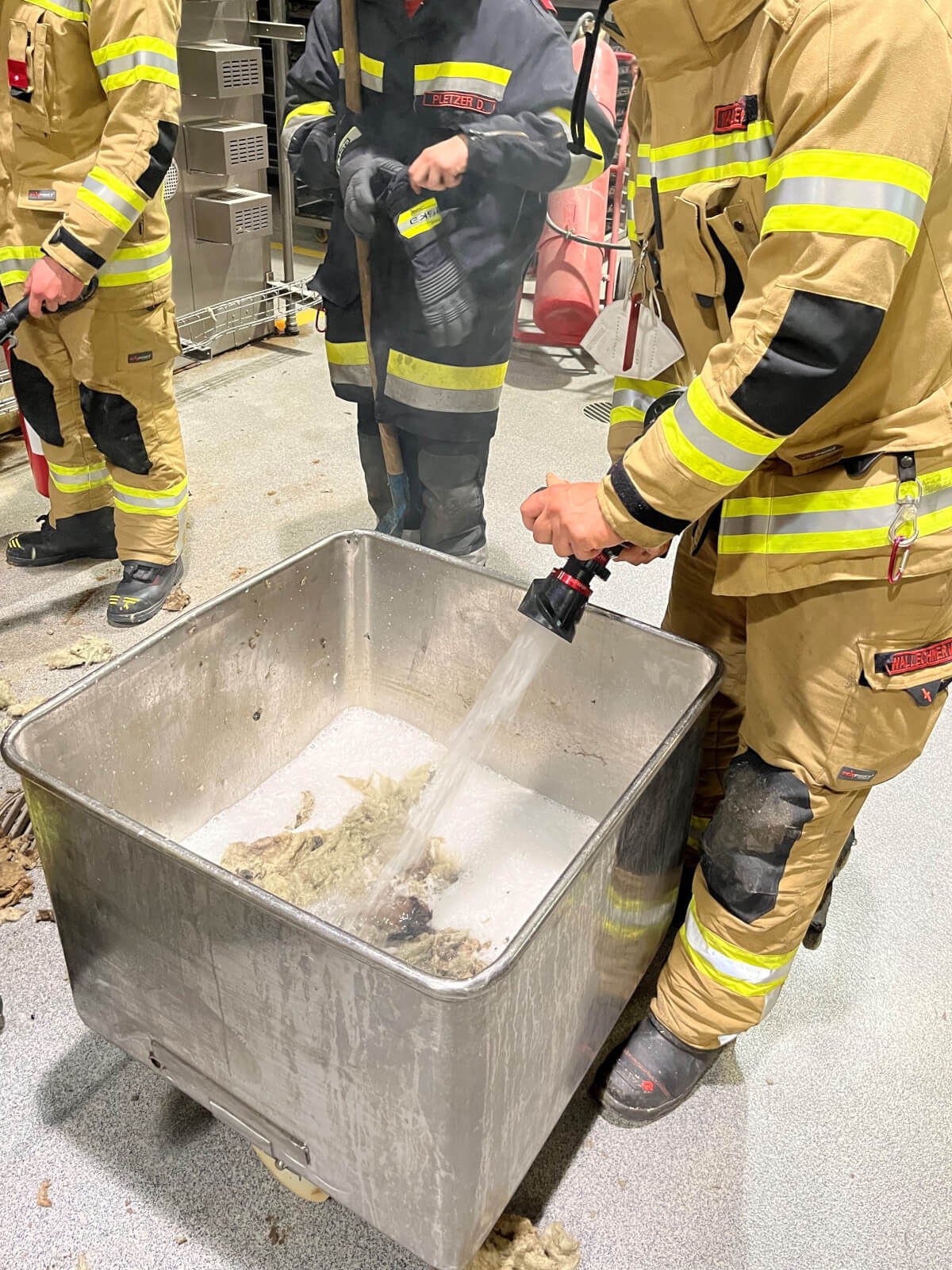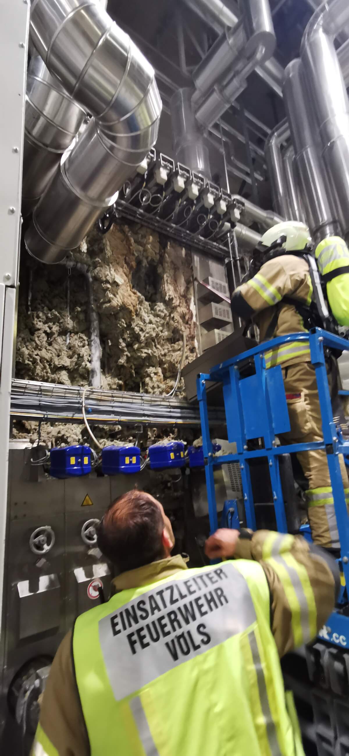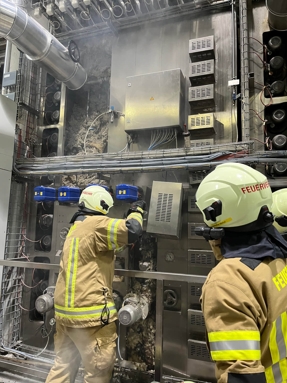 Im Rahmen des Brandmeldealarmes beim Altersheim wurde die Feuerwehr Völs telefonisch verständigt, dass es im Bereich eines Produktionsbetriebes in Völs aufgrund von Schweißarbeiten zu einer Glimmbrandentwicklung gekommen ist. Somit handelte es sich um einen Folgeeinsatz ohne Zusatzalarmierung. Bei Eintreffen des Einsatzleiters konnte nach Erkundung mit den Technikern vor Ort festgestellt werden, dass es bei einem Thermoölofen hinter diversen Verkleidungen zu einer Glimmbrandentwicklung gekommen ist. Die Aufgabe der Feuerwehr bestand darin, in Zusammenarbeit mit den Technikern die Verkleidungen zu demontieren und die glimmende Dämmwolle zu entfernen. Diese Arbeiten wurden von der Feuerwehr Völs mittels schweren Atemschutz unter Anwendung von Schanzwerkzeug und des Speziallöschmittels F500 durchgeführt. Nach Kontrolle mit der Wärmebildkamera und Durchnässung des restlichen Dämmmaterials konnte der Einsatz für die Feuerwehr Völs beendet werden und dem Betreiber unter Anweisung des Erfordernisses einer Brandsicherheitswache und laufenden Kontrolle übergeben werden.