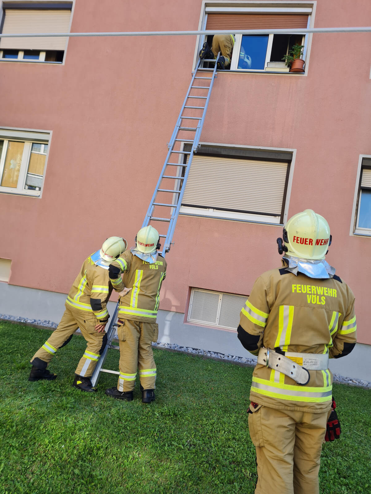 Mittels Steckleiter ist die Feuerwehr Völs über ein offenes Fenster in die sich im ersten Obergeschoss befindliche Wohnung eingestiegen und konnte die Wohnungstüre für den Rettungsdienst öffnen. Die Person wurde im Anschluss an diesen übergeben.