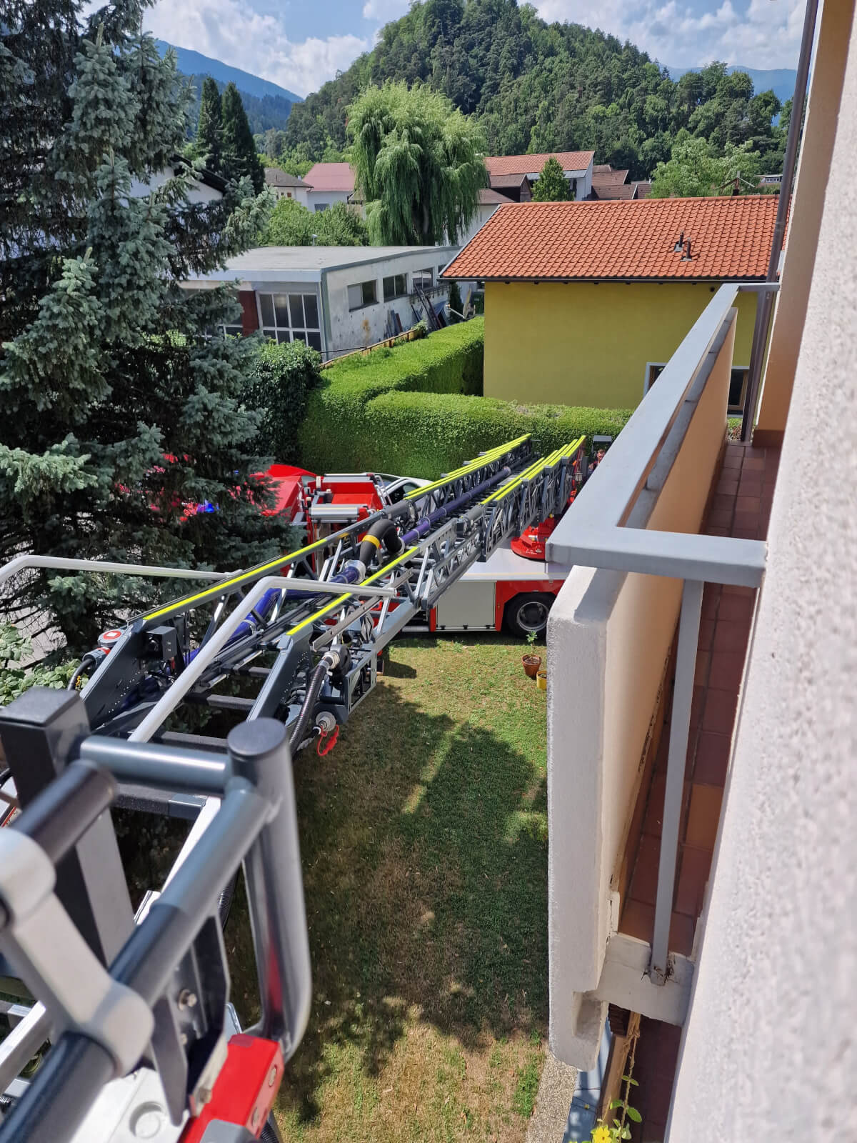 Als der Einsatzleiter der Feuerwehr eintraf, konnte nach kurzer Lageerkundung festgestellt werden, dass das Fenster der betroffenen Wohnung im zweiten Stock geöffnet und nur halb von der Jalousie verdeckt war. Deshalb wurde von der Besatzung des "Tank 1" eine Schiebeleiter vorbereitet. Währenddessen wurde auf der anderen Seite probiert, ob die Wohnungstüre zerstörungsfrei geöffnet werden konnte. Da diese jedoch versperrt und mit dem Schlüssel von innen zugesperrt war, war dies jedoch nicht möglich.