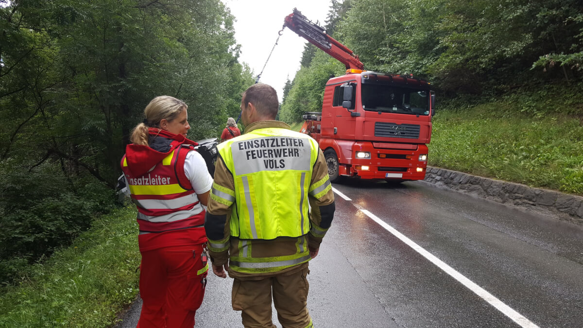 Am Mittwoch wurde die Feuerwehr Völs zu einem schweren Verkehrsunfall auf die Götzner Straße alarmiert. Aus bisher unbekannter Ursache, geriet das Fahrzeug von der Fahrbahn ab und blieb etwa 30m unterhalb der Straße in steilem abschüssigem Gelände liegen. Die beiden verletzen Fahrzeuginsassen konnten sich selbst aus dem total zerstörten Wrack befreien und noch selbstständig die Böschung hinauf klettern. Das Fahrzeug wurde im Anschluss mittels Seilwinde geborgen. Die Landesstraße musste für die Dauer des Einsatzes vollständig gesperrt werden.