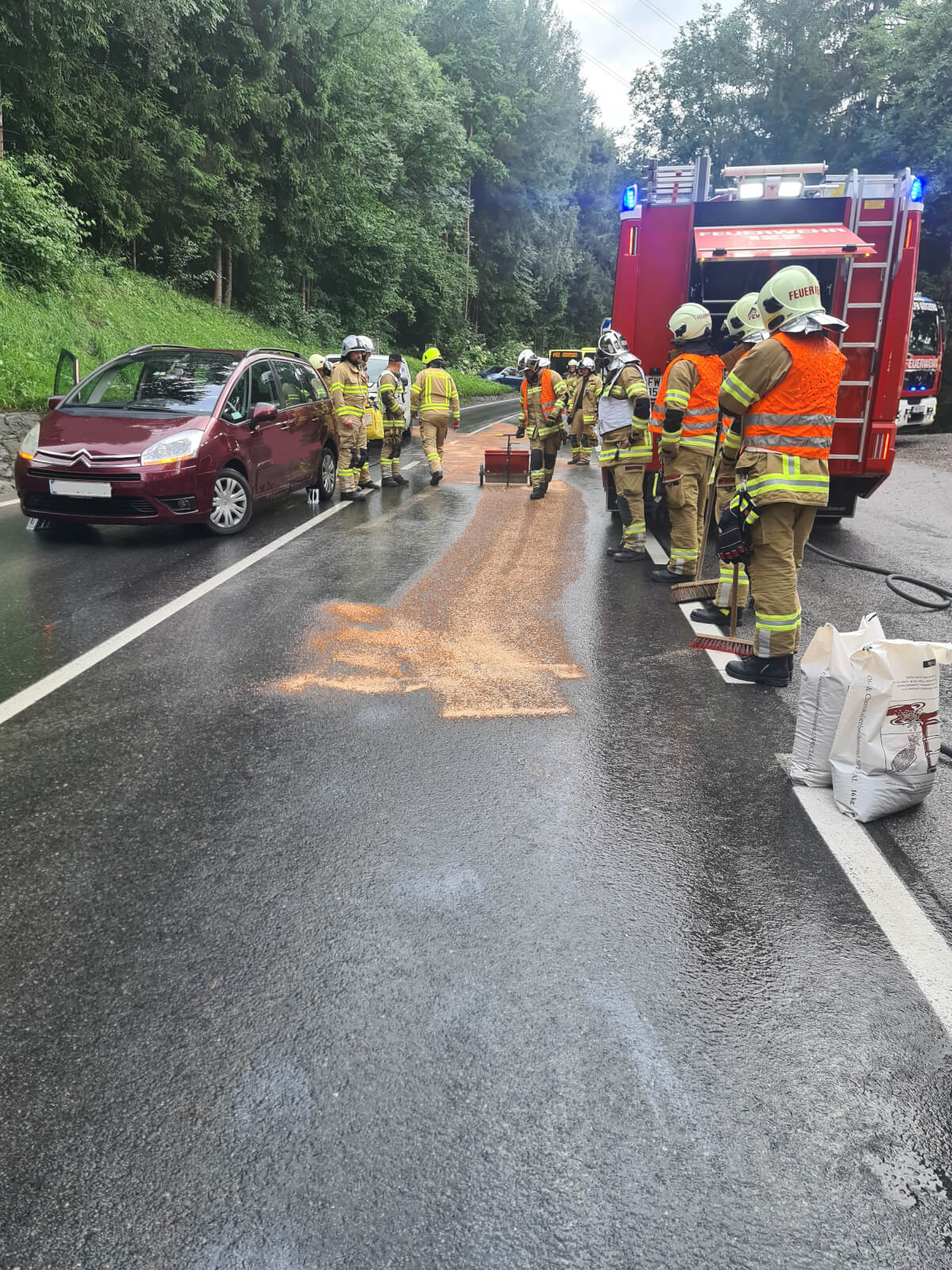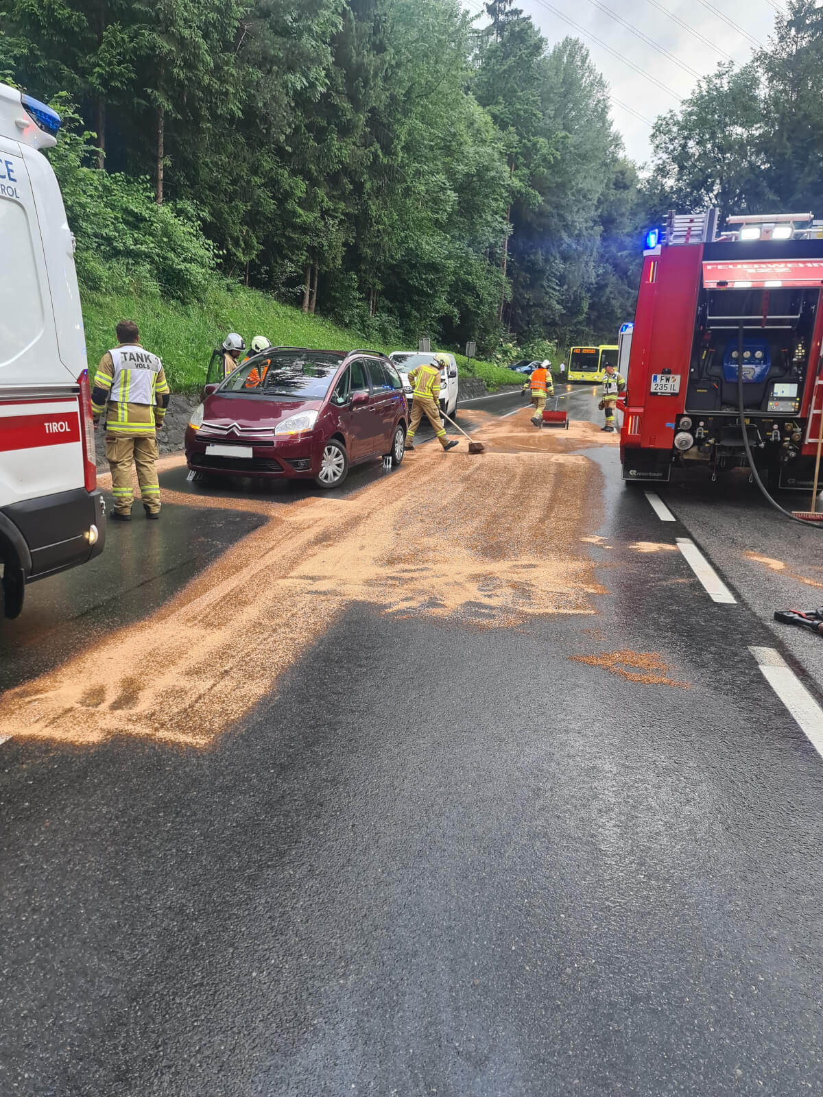 Am Dienstagabend wurde die Feuerwehr Völs und Götzens zu Aufräumarbeiten nach einem Verkehrsunfall auf die Götzner Landesstraße alarmiert. Die Straße wurde jeweils am oberen und unteren Ende gesperrt. Ein vorbeugender Brandschutz wurde aufgebaut und die Ölspur mittels Ölbindemittel gebunden.