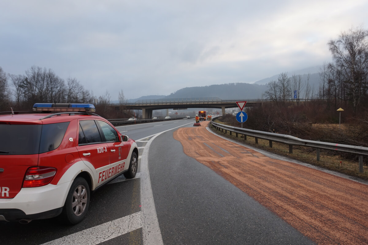 Bindemittel wurde großflächig auf der vorhandenen Kraftstoffspur aufgebracht. Für die Dauer des Einsatzes wurde die Auffahrt zusammen mit der Polizei sowie der Asfinag gesperrt.