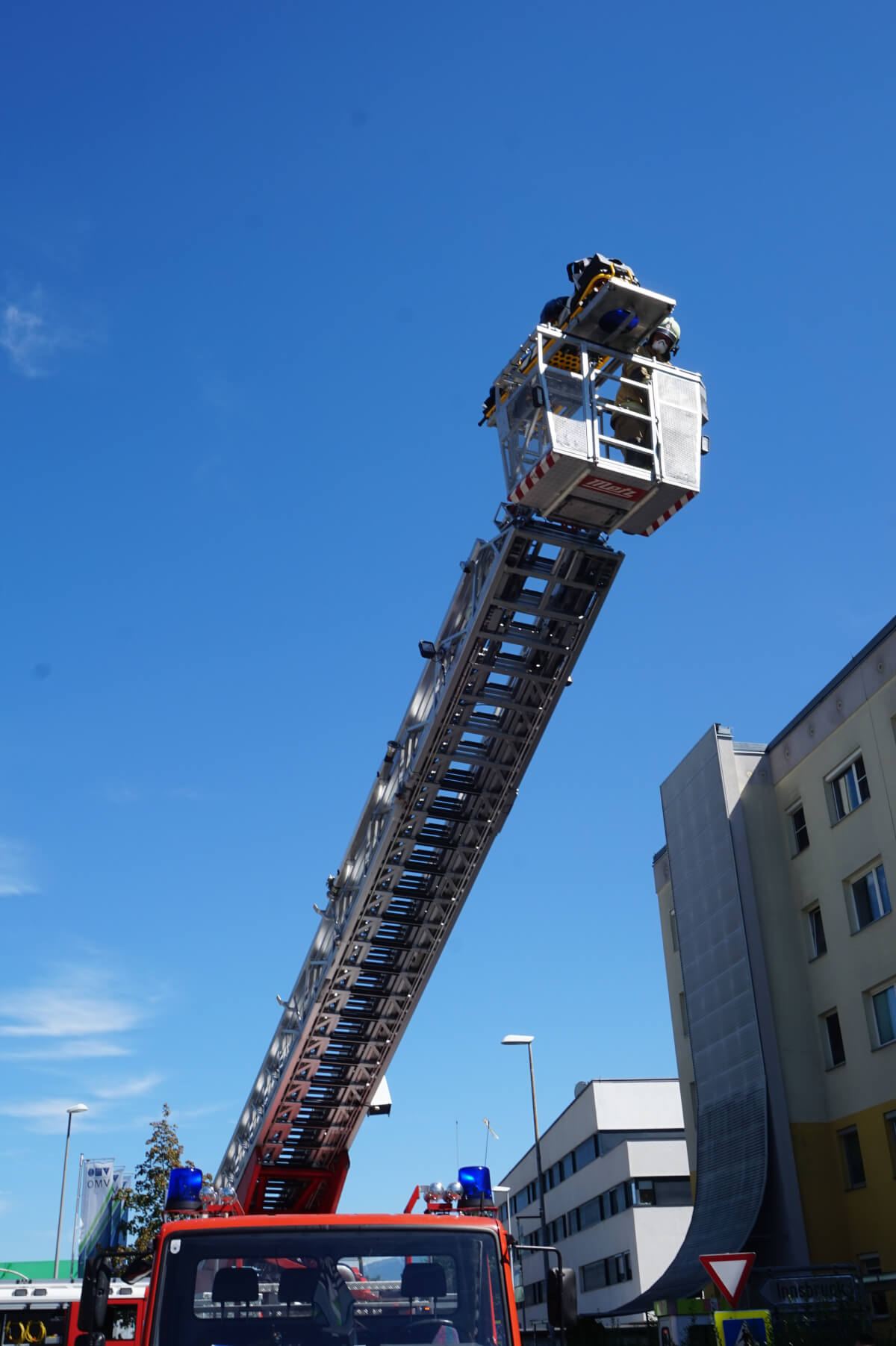 Zum zweiten Mal an diesem Tag wurde die Feuerwehr Völs alarmiert. Diesmal wurde die Feuerwehr von der Rettung zur Unterstützung gerufen. Eine Person musste mittels Drehleiter aus dem vierten Stock gerettet werden.