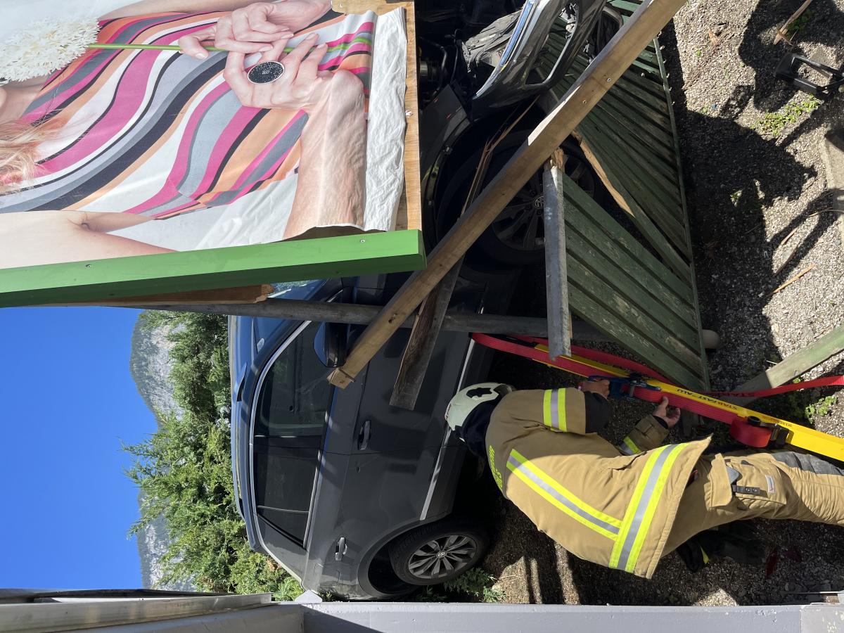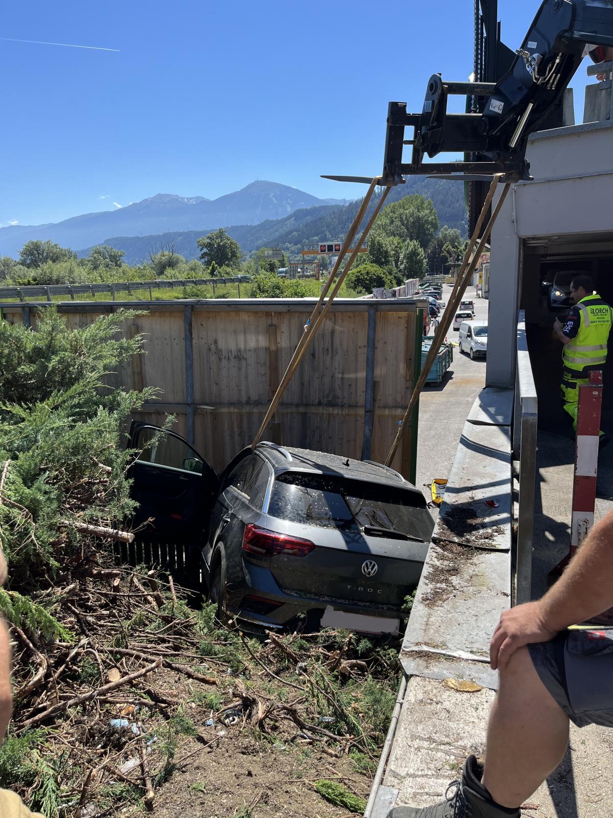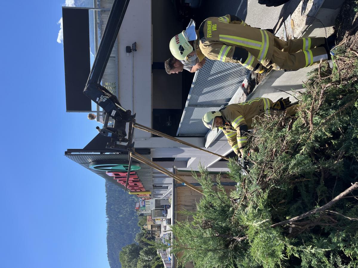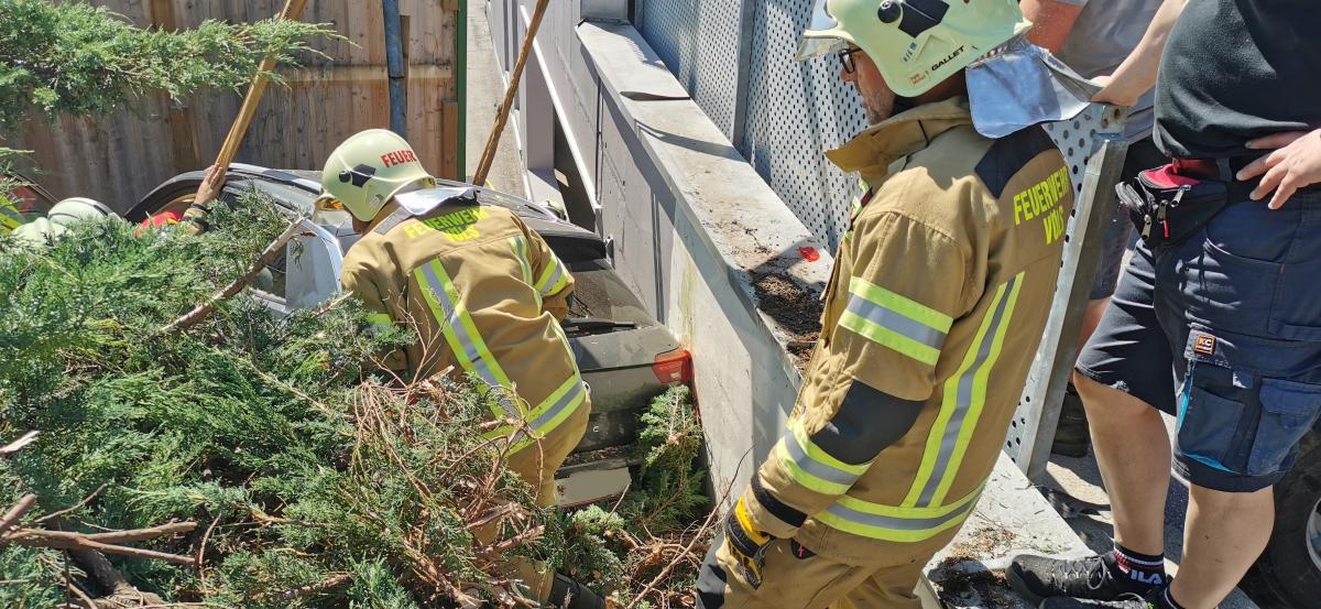 Am Dienstagnachmittag wurde die Feuerwehr Völs zu einem Verkehrsunfall am Gelände des Einkaufszentrums Cyta gerufen. Bei Eintreffen wurde festgestellt, dass ein PKW über steiles Gelände beim Abfahren von einer Parkdeckrampe abgestürzt war und sich eine Person noch im Fahrzeug befunden hat. Die Erstmaßnahmen waren die Fahrzeugstabilisierung und Patientenbetreuung in Form eines inneren Retters. In Zusammenarbeit mit der Rettung und dem Notarzt wurde die Person aus dem verunfallten Fahrzeug mittels KED-System (Rettungskorsett zur Stabilisierung der Wirbelsäule) und Spineboard gerettet. Weitere Maßnahmen waren die Absicherung der Unfallstelle und Beihilfe beim Abtransport des Fahrzeuges.