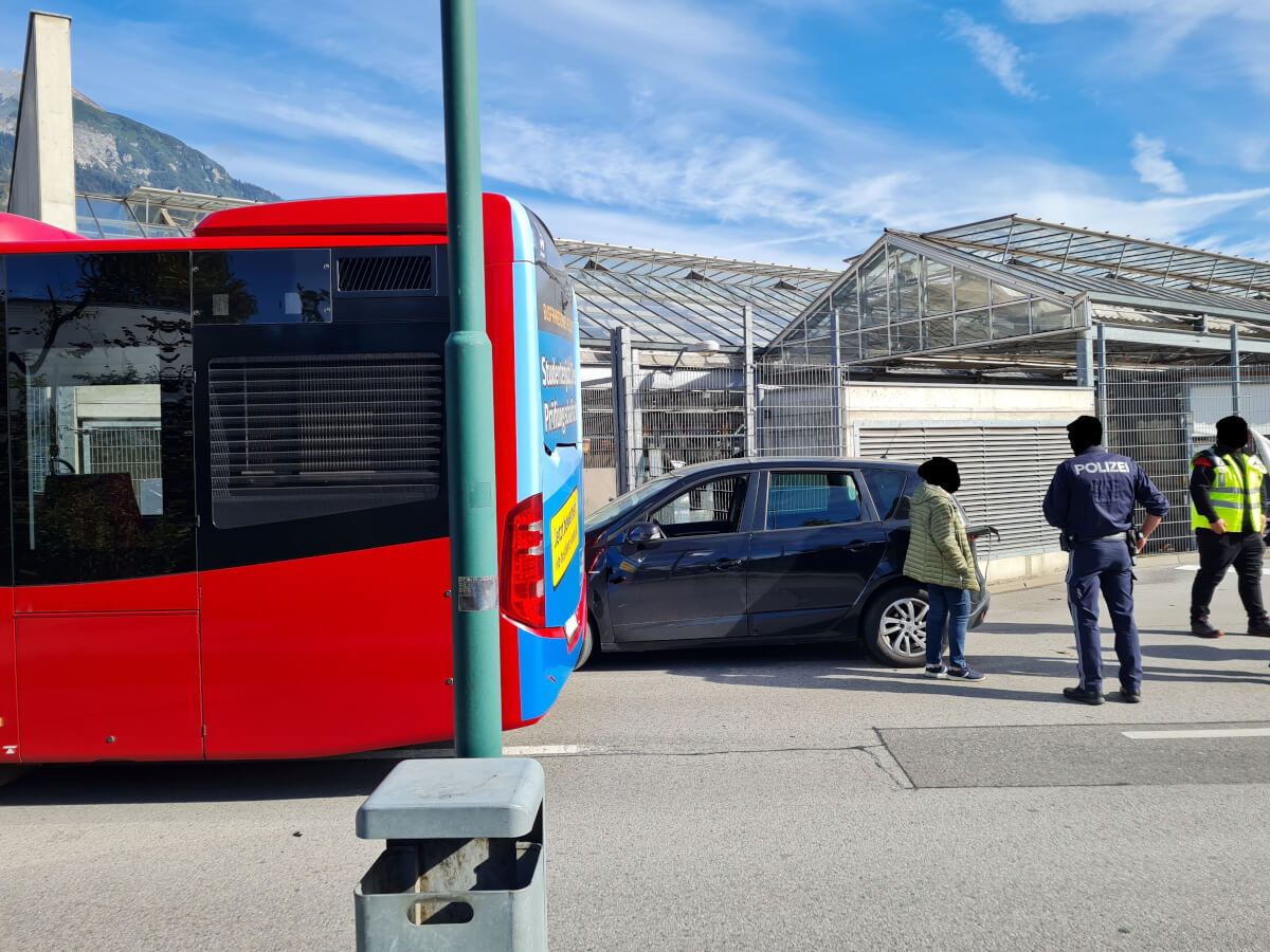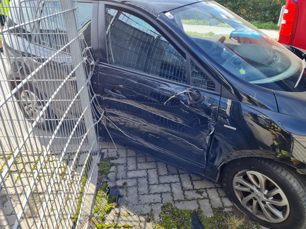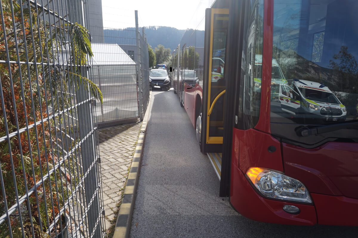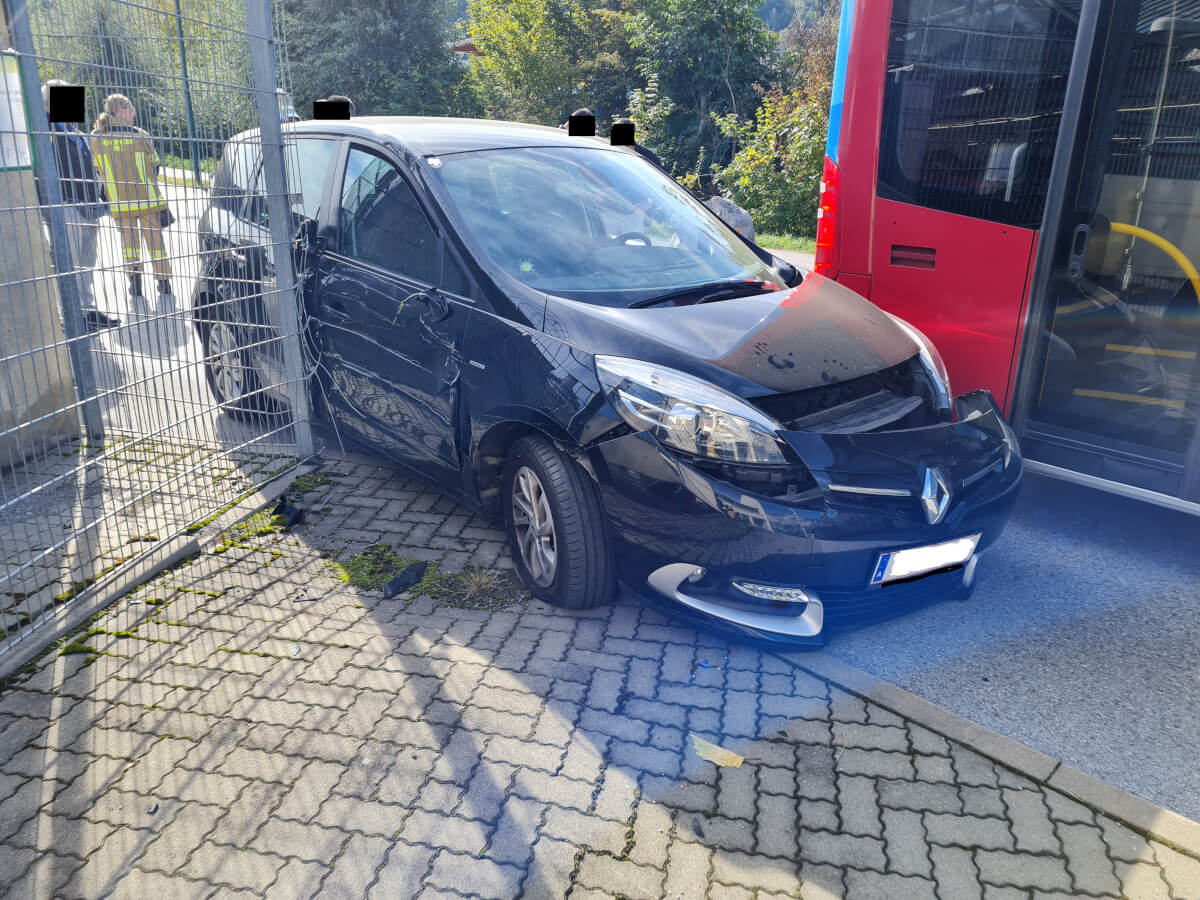 Vor Ort konnte festgestellt werden, dass ein PKW zwischen einem Bus sowie einem Zaun aufgrund eines Zusammenstoßes beider Fahrzeuge feststeckte.
