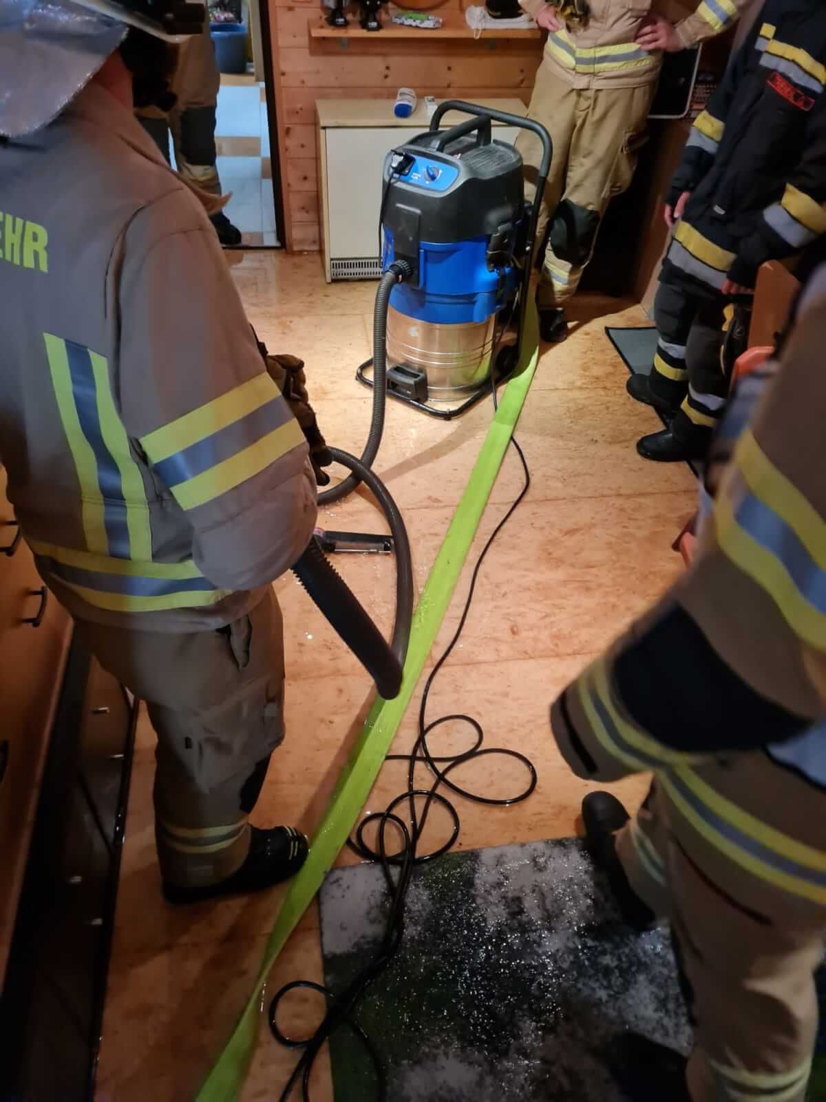 Aufgrund einer defekten Wasserleitung war ein Kellerabteil in einem Reihenhaus mit circa 4 cm Wasser gefüllt. Mittels Wassersauger wurde das Wasser aus dem Kellerabteil entfernt.