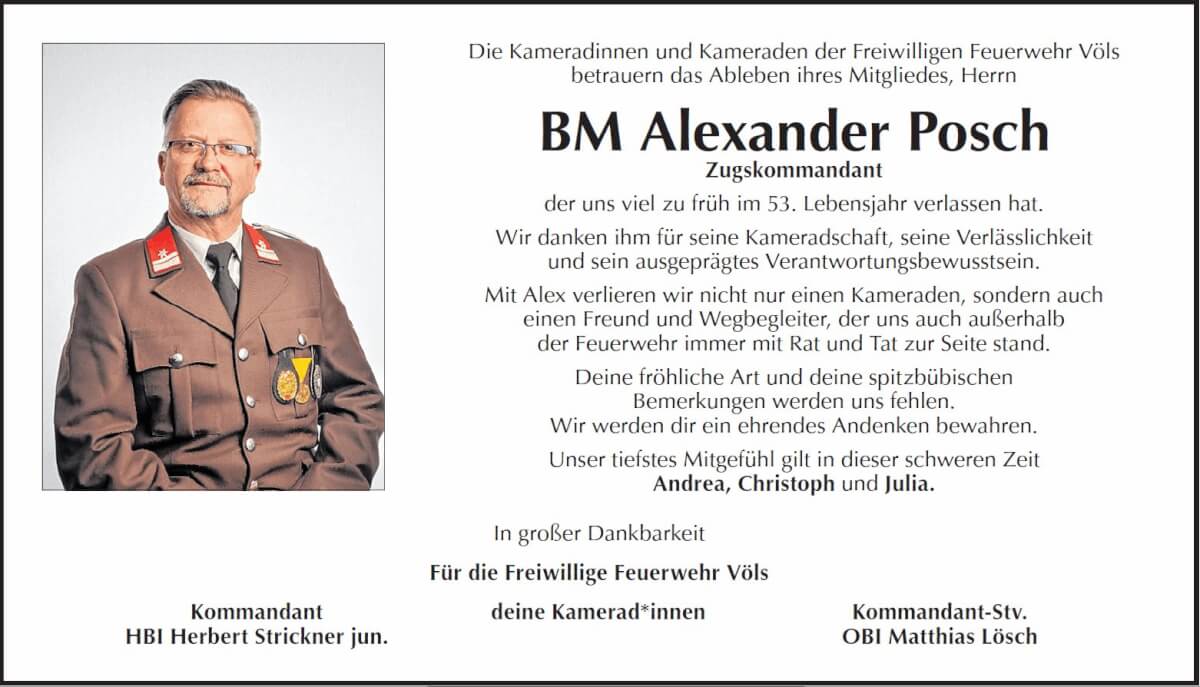 Am 21. August 2022 verstarb plötzlich und unerwartet unser langjähriges Mitglied BM Alexander POSCH im 53. Lebensjahr.
