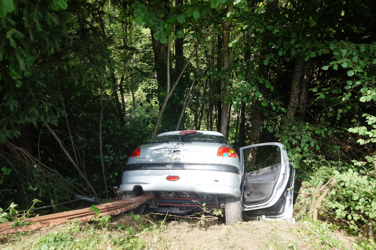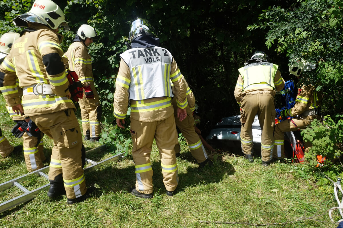 Direkt im Anschluss ging es zu einem abgestürzten Fahrzeug. Die Aufgabe der Feuerwehr bestand hier darin, das verunfallte Fahrzeug zu sichern, um ein weiteres Abstürzen zu verhindern und die verletzten Personen gemeinsam mit dem Rettungsdienst unter Anleitung des sich vor Ort befindlichen Notarzt zu befreien.