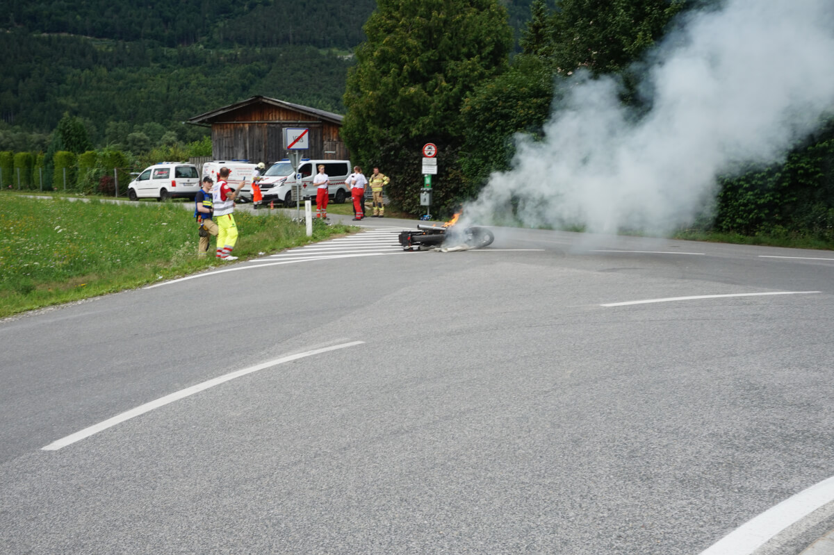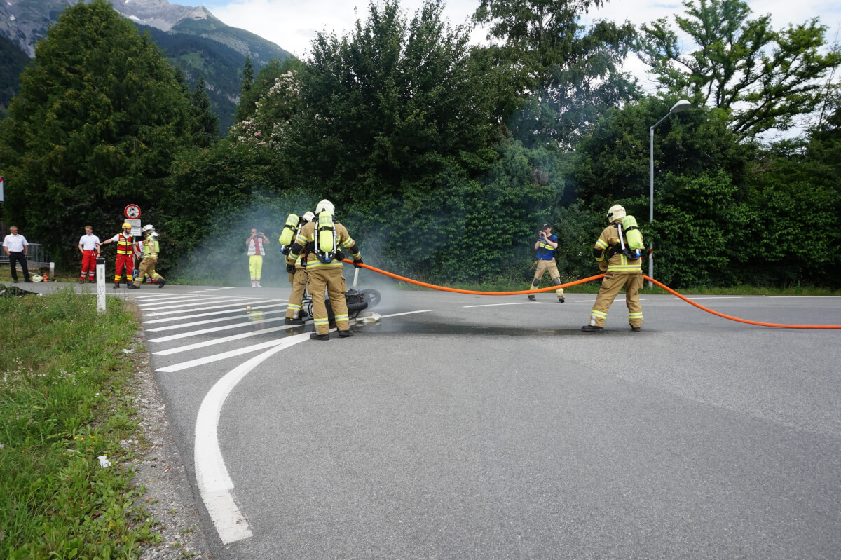 Gegen 15:30 Uhr stand bereits das nächste Szenario auf dem Plan, in dem ein PKW und ein Motorrad kollidierten und besagtes Motorrad Feuer fing. Der Brand wurde unter Atemschutz gelöscht und die Person, welche sich noch im PKW befand, mittels Zuhilfenahme von Hydraulischen Rettungsgerät aus dem Fahrzeug befreit.
