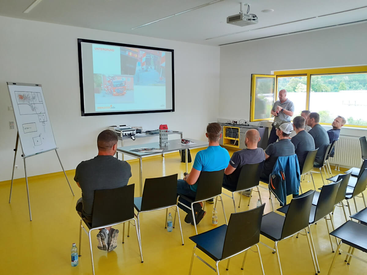 Dabei wurden in einem Theorieteil die Einsatzmöglichkeiten und Gefahren mit Drehleitern besprochen.