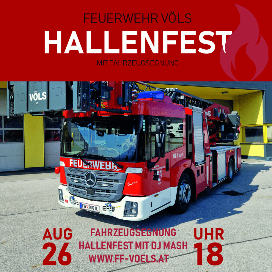 Am 26. August um 18:00 Uhr findet unser Hallenfest sowie die Segnung unserer neuen Drehleiter im Feuerwehrhaus, Florianiweg 6 in Völs statt.