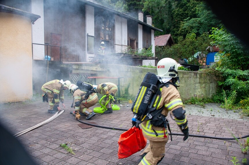 Mit der Meldung „Brand Haus, Dorfplatz, mehrere Personen eingeschlossen“ wurde die Hauptübung und somit die letzte Übung an diesem Tag gestartet. Unter schwerem Atemschutz musste ein Innenangriff vorgenommen und vermisste bzw. verletzte Personen gerettet werden. Die Einsatzstelle wurde abgesichert, die Wasserversorgung sichergestellt und ein Außenangriff über die Drehleiter vorgenommen. Nach Übungsende wurde die Einsatzbereitschaft wieder hergestellt.